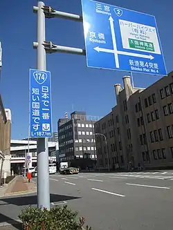 National Route 174 measures just 187 meters (614 ft) from its southern terminus at the Port of Kobe to its northern terminus, a junction with National Route 2 in Chūō-ku, Kobe. This brief routing makes it the shortest out of all of Japan's national highways.[2]