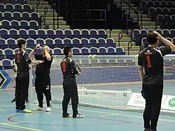 ![]() Japan defending a throw from Thailand. Regional goalball championships, Chiba, Japan (2019). | |