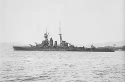 Following the end of World War I, the Japanese Empire gained control of former German possessions in the central Pacific per the terms of the Treaty of Versailles.[12] Due to Japan's warm relations with the British Empire and the United States at the time, Hiei and other Japanese warships became significantly less active after the war. Other than a patrol alongside Haruna and Kirishima off the Chinese coast in March 1919, Hiei remained in the Japanese home ports.[5] On 13 October 1920, she was placed in reserve. Following the Great Kantō earthquake of September 1923, the capital ships of the Japanese Navy assisted in rescue work until the end of the month. Hiei arrived at Kure Naval Base on 1 December 1923 for a refit which increased the elevation of her main guns from 20 to 33 degrees and rebuilt her foremast.[5]