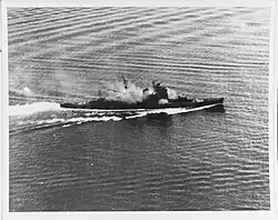 Haguro (羽黒) was a Myōkō-class heavy cruiser of the Imperial Japanese Navy, named after Mount Haguro in Yamagata Prefecture. Commissioned in 1929, Haguro saw significant service during World War II, participating in nine naval engagements between 1942 and 1945. As a heavy cruiser, she was better armed and armored than most surface vessels, and had multiple battles during her combat career. In the early part of the war, she engaged in vigorous shore bombardment duties to support the Japanese invasions of the Philippines and Dutch East Indies, and took part in the destruction of the Allied cruiser force defending the Dutch East Indies in the Battle of the Java Sea from 27 February to 1 March 1942. With torpedo hits, Haguro sank the Allied flagship, the light cruiser HNLMS De Ruyter, and the destroyer HNLMS Kortenaer, and with gunfire received primary credit for sinking the heavy cruiser HMS Exeter, and was not damaged during the entire battle.[2]