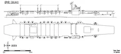 As part of the conversion, the existing superstructure was razed, a new hangar deck was built above the existing upper deck and a full-length 205-meter (672 ft 7 in) flight deck was added. It had a maximum width of 23 meters (75 ft 6 in), two 13-by-11.6-meter (42.7 by 38.1 ft) aircraft elevators that serviced the single hangar and a small starboard island structure. The ship was bulged to improve her stability, which increased her beam to a maximum of 21.2 meters (69 ft 7 in). Ibuki's trials displacement increased to 14,800 metric tons (14,600 long tons) and the additional weight increased her draft to 6.31 meters (20 ft 8 in).[12]