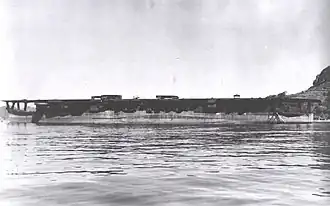 Ibuki was laid down at the Kure Naval Arsenal, Kure, on 24 April 1942;[13] however, her construction was suspended on 30 June. Construction resumed on 30 July to allow the ship to be launched as soon as possible. She was named after Mount Ibuki on 5 April 1943 as per the IJN's naming convention for first-class cruisers. The ship was launched on 21 May and construction was suspended in July until the IJN decided to convert her into a light aircraft carrier the following month. While plans were prepared for the conversion, she was towed to the Sasebo Naval Arsenal, Sasebo, by the submarine tender Jingei on 19–21 December.[14]