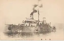 At the Battle of Tsushima on 26 May 1905, Kasuga was fifth in the line of battle. At about 14:10, Kasuga opened fire on the battleship Oslyabya, the lead ship in the second column of the Russian fleet. Due to the limited visibility and heavy smoke during the battle detailed knowledge is not available about her activities during the rest of the day's action.[24] The surviving Russian ships had been located near the Liancourt Rocks by the Japanese the following morning and Tōgō reached them about 10:00. Heavily outnumbering the Russians, he opted for a long-range engagement to minimize any losses and Kasuga opened fire at the obsolete battleship Imperator Nikolai I at a range of 9,100 meters (10,000 yd). The ship hit her target's funnel on her third salvo and the Russians surrendered shortly afterwards.[25]