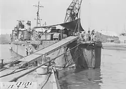 She was subsequently reassigned to Maizuru for use as a training and guard vessels. On 30 July 1945, Hatsushimo struck an air dropped naval mine while under attack from United States Navy aircraft from TF38 at Miyazu Bay, forcing her crew to beach her at 35°33′N 135°12′E / 35.550°N 135.200°E. The attack killed 17 crewmen. Hatsushimo was the 129th and last destroyer of the Imperial Japanese Navy to be lost during the war.[12][15]