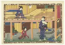 The Japanese kitchen (Japanese: 台所, romanized: Daidokoro, lit. 'kitchen') is the place where food is prepared in a Japanese house. Until the Meiji era, a kitchen was also called kamado (かまど; lit. stove)[1] and there are many sayings in the Japanese language that involve kamado as it was considered the symbol of a house. The term could even be used to mean "family" or "household" (much as "hearth" does in English). Separating a family was called kamado wo wakeru, or "divide the stove". Kamado wo yaburu (lit. "break the stove") means that the family was broken.