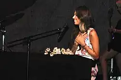 After premiering the song on So You Think You Can Dance, Perri returned to the stage on July 17, 2010, performing the song live for the first time.[27] In an interview with Entertainment Weekly, Perri discussed her thoughts on performing on the show after premiering it on the same show, stating "I am very nervous, but very excited. It’s almost like my first child is 'So You Think You Can Dance'. I will do whatever they want me to do. And if it’s perform in front of millions of people, I’ll do that too. I’m pretty certain this is gonna be the biggest audience I’ve ever performed for."[4] Perri has additionally performed the song live on and The Early Show on CBS and the Today Show on NBC in August 2012.[28] On July 29, 2010, Perri also performed on The Tonight Show with Jay Leno, replacing Stone Temple Pilots who couldn't make it to the show on time.[29] On December 7, 2010, Perri performed the song on Conan O'Brien's new show, Conan, with many critics naming the performance a career peak and stellar.[30] On November 2, 2010, VH1 allowed Perri to perform the song, along with other tracks from her EP, in the elevator lobby as part of an ongoing "Live At VH1" series.[31] The performances were recorded and shown through VH1's video-hosting sites.[31] In October 2011, Perri performed the song live on The Late Late Show, an Irish chat show hosted by Ryan Tubridy. On November 13, 2011, Perri performed the song live on the Strictly Come Dancing Results Show. On January 29, 2012, Perri performed the song live on Dancing On Ice. On February 18, 2012, she performed the song before the world heavyweight boxing championship fight between Vitali Klitschko and Derek Chisora in Munich. Also Perri performed the song as part of the encore for her first tour Lovestrong Tour in 2011/12.