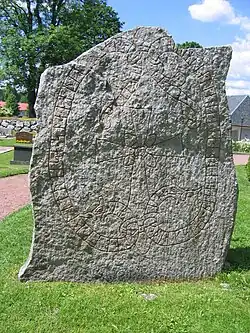 The inscriptions have led to a controversy on the meaning of the Old Norse verb eiga ("to own"), and to a debate on the origins on the hundred division.[4] It is debated whether he really owned the hundred or if he was appointed as its chieftain (hersir) by the King of Sweden, and a final conclusion is probably impossible to arrive at.[2]