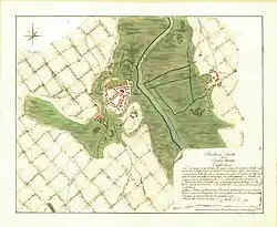 The area was part of the Duchy of Pomerania, which in 1186 passed under Danish suzerainty,[2] and in 1227 fell under the overlordship of the multi-ethnic Holy Roman Empire. The actual town was founded during the Ostsiedlung, after 1250. Documented as Germin (1269), Jermin (1277)[3] or Jermyn (1290). The name comes from the Old Polabian male name Jaromin.[4] It was part of the possessions of the Cammin bishops, until they gave it to Otto I, the Pomeranian duke, as a fief in 1305. Jarmen remained a small town, but prospered moderately because of its location at a ford and the maintenance of a ferry service since 1368. In 1631, Jarmen became seat of the Amt Ueckermünde. At this time, the Thirty Years' War had already reached the area, which became Swedish in the following.