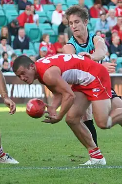 ![]() Moore (centre) struggling for possession against Port Adelaide's Hamish Hartlett in 2009 | |||