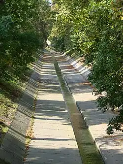 Starting with the late 1830s, with the advent of steam engines in the city's factories, the river ceased to function primarily as a source of water power and became a recipient of waste water.[19] The situation deteriorated throughout the nineteenth and into the twentieth century as the river continued to receive significant amounts of polluted waters.[20] In the 1890s Karl Scheibler's factory was established directly above the river, which flowed beneath the factory's floor, enabling easy discharge of industrial waste.[21][22] When the construction of the city's sewer system began in 1925, the city's natural river network, including Jasień, was incorporated within the new underground canal system,[23] and the river valley is now marked in some sections of the city centre only by the landscape retaining some of the original valley slopes,[24] with the stream itself hidden from view for more than one third of its course.[25] As the Jasień became part of the city's canal system, its main function became the transfer of both industrial and residential waste water and rainfall outside Łódź towards the Ner river.[26][27] The twentieth century saw the construction of chemical plants on the Jasień, and the river was used for the disposal of toxic waste. It was only after the fall of communism in 1989 and after the collapse of the textile industry that the production of waste was reduced by 60%.[28] The contamination levels in the waters of the Jasień have been systematically dropping since then.[29] The current status of the river is that of an engineered stream whose function is to discharge rainfall from the area of the city.[30] Only the final section of the Jasień in Rokicie survives in its natural, meandering form.[31]