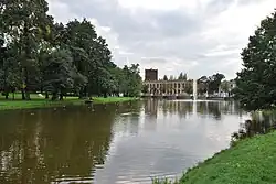 The largest of the ponds on the Jasień river is that in the Księży Młyn district. Historical sources date the existence of the pond back to the early sixteenth century.[32] Enlarged in the early nineteenth century to boost hydropower production, the pond had an area of 5 ha, but by the end of the century its function was only recreational.[33] The residence of Edward Herbst, Karl Scheibler's son-in-law, was built on its northern side between 1875 and 1877, and the pond became part of the residential complex.[34] In the 1970s the area of the pond was reduced to 3.46 ha due to the construction of a nearby road.[35]