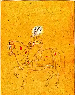 ![]() Equestrian painting of Jassa Singh Ahluwalia on horseback in-front of his haveli with a fly-whisk attendant, circa late 18th century | |
