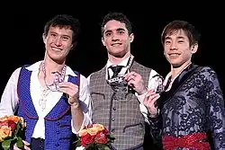 Fernández ended his season at the 2014 World Championships in Saitama, Japan. He skated a clean short program and earned 96.42 points, improving on his personal best in the segment by 4.86 points.[53] He stood in third place behind Sochi Olympic champion Yuzuru Hanyu and Tatsuki Machida of Japan. He landed three quads in his free skate along with five triples, but singled a planned triple Lutz and added only a double as the second jump of his quad Salchow combination.[54] He placed third in the segment with 179.51 points for a total score of 275.93, and repeated as World bronze medalist, behind Hanyu (gold) and Machida (silver).