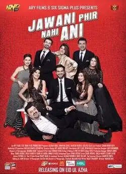 Jawani Phir Nahi Ani (lit. 'Youth won't come again'), sometimes abbreviated as JPNA is a 2015 Pakistani adventure comedy film directed by Nadeem Baig. It was co-produced by Humayun Saeed, Salman Iqbal and Shahzad Nasib at Saeed's production house, Six Sigma Plus. It is the first installment in the Jawani Phir Nahi Ani film series. The film stars Humayun Saeed, Hamza Ali Abbasi, Ahmad Ali Butt, Vasay Chaudhry and Mehwish Hayat.[2][3] The supporting cast includes Sohai Ali Abro, Jawed Sheikh, Ismail Tara, Bushra Ansari, Ayesha Khan, Sarwat Gillani and Uzma Khan. The film is about a single man who is a divorce lawyer. He takes his three married friends on a trip to help them escape their wives and the monotony of their lives.