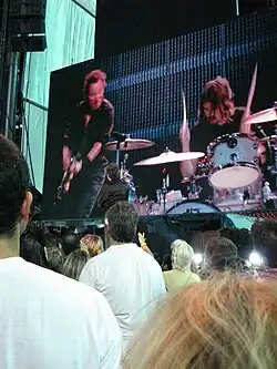 Once the initial portion of the tour began in early April 2009, Weinberg played from several songs to half the show on most of the dates.[11][15][18][19] He received a very positive reaction from both audiences and reviewers as a re-energizing "spark plug"[19] for the much-older band,[20] with his vigorous, long-hair-flying style inviting comparisons to Dave Grohl[21] and his potential for replacing his father drawing allusions to Wally Pipp.[10][18] He began playing complete shows in mid-May 2009 during the tour's American first leg, as his father went to California to prepare test runs for The Tonight Show start.[12][20] Modern Drummer magazine's editor said that a college freshman playing on one of the year's biggest rock tours is "certainly a unique story".[12] Weinberg played a number of dates early on in the European second leg of the tour, including at the Dutch Pinkpop festival in Landgraaf, Netherlands in addition to Bonnaroo in Manchester, Tennessee. He also played during a few dates of the American third and final leg. When not needed for the Springsteen tour, he continued to play for the Reveling, often before audiences that were three orders of magnitude smaller; he said of the difference, "I liked the duality of it all ... I like doing this just as much as I like doing that."[15]
