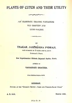 Herbert Mills Birdwood and MacNaghten attempted to help Indraji obtain a suitable employment but Indraji would not accept working with anyone but Bhagwan Lal. Through MacNaghten, the Maharaja of Porbander offered assistance for Indraji to study the flora of the Barda mountain. Frederick Styles Philpin Lely, the British administrator for Porbander also supported the project and Indraji was appointed as Curator of Forests and Gardens of the state of Porbander on 1 October 1886. Initially Indraji declined the offer as the salary was Rupees 100 a month but on the influence of MacNaghten and Lely this was increased to 200 and he took the offer. Jayakrishna worked with the local shepherd community, the Rabaris, to collect ethnobotanical information. One of his studies was on the lethal effects of Indigofera cordifolia on sheep that grazed them shortly after the rains.[13] He worked for 19 years in the region and produced his magnum opus, on the Flora of Barda Mountain only in 1910. Although he was persuaded to write it in English, he chose to write it in Gujarati and titled it "Vanaspati Śāstra, A Complete and Comprehensive Account of the Flora of Barda Mountain". He wrote: "Europeans placed in their countries know and write about the plants of this country, and my countrymen would not know about the plants in their courtyard and those trampled under their feet. I will write the book in my mother tongue". When the manuscript of the book was ready, the Maharaja of Porbander had died and there was no monetary support for it. Finding a publisher was difficult. He once met Lalshankar Umashankar on a train and the latter offered to print the book through the Gujarat Vernacular Society on the condition that he removed the dedication page to the King of Porbander State. Indraji refused to accept the condition. He finally printed it at his own cost, pawning some of his wife's jewellery, and only a 1000 copies were printed with many left unsold that forced him to halve the price. He retired and moved to Kutch where the Maharaja of Kutch took an interest and made him Superintendent of the Palace and made him in-charge of reforestation and planting. He promoted the use of tree planting to block the expansion of dunes and wrote a book Plants of Kutch and Their Utility (1926) which included 99 line drawings.[12]