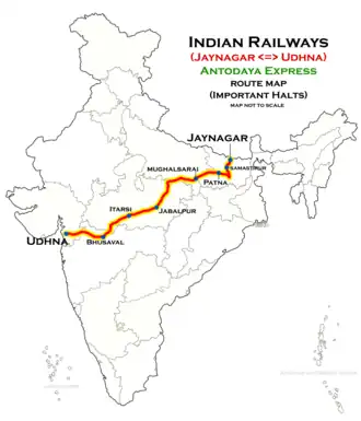 Jaynagar–Udhna Antyodaya Express is an Express train belonging to East Central Railway zone that runs between Jaynagar and Udhna Junction. It is currently being operated with 15563/15564 train numbers on a weekly basis.[1][2][3][4]
