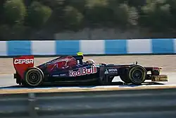 Vergne had his first outing in a Formula One car at the Goodwood Festival of Speed in July 2010, driving a Red Bull RB5.[26] In September 2010, it was announced that he would drive for Toro Rosso in the post-season young driver test to be held at the Yas Marina Circuit in November,[26] with the team later confirming that he would drive the Toro Rosso STR5 for both days of the test.[27] On the first day of the test he set the seventh fastest time with a lap of 1:42.489, completing 93 laps in the process.[28]