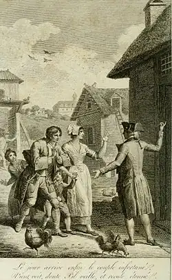 Amongst other large works, he engraved "The Siege of Calais", after Jean-Simon Berthélemy. He dedicated the engraving to the National Assembly, who accepted the honour officially in a session of 16 September 1789. The citizens of Calais also showed their appreciation by making him a "Burgher of Calais" on 21 January 1790. He also engraved, after Nicolas-André Monsiau, "Molière lisant son Tartuffe chez Ninon de Lenclos.[1][3]