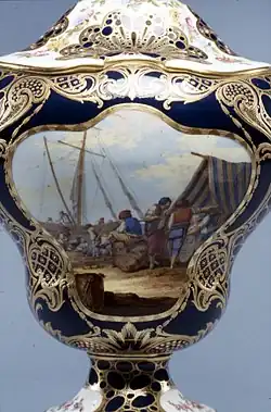 Jean-Louis Morin (1732-1787) was a French porcelain painter who worked at the Sèvres Porcelain Manufactory from 1754 to 1787.[1] He was a specialist in figure painting known for his depictions of military and marine scenes which he painted on useful wares, as well as ornamental and flower vases.[2] Unusually he used his own sketches for the design of the paintings.[3] His artist's signature featured a scrolling upper or lower cased letter M.[2]