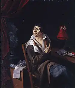 Marat anonymously published his first contribution to the revolution in February 1789, titled Offrande à la Patrie (Offering to the Nation), which touched on some of the same points as the Abbé Sieyès' famous "Qu'est-ce que le Tiers État?" ("What is the Third Estate?").[30] Marat claimed that this work caused a sensation throughout France, though he likely exaggerated its effect as the pamphlet mostly echoed ideas similar to many other pamphlets and cahiers circulating at the time.[31] This was followed by a "Supplément de l'Offrande" in March, where he was less optimistic, expressing displeasure with the King's Lettres Royales of 24 January. In August 1789, he published La Constitution, ou Projet de déclaration des droits de l'homme et du citoyen, intended to influence the drafting of France's new constitution, then being debated in the National Assembly.[30] In this work, he builds his theories upon ideas taken from Montesquieu and Rousseau, claiming that the sovereignty of the nation rests with the people and emphasizing the need for a separation of powers. He argues for a constitutional monarchy, believing that a republic is ineffective in large nations.[32] Marat's work elicited no response from the National Assembly.