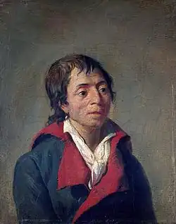 Jean-Paul Marat was born in Boudry, in the Prussian Principality of Neuchâtel (now a canton of Switzerland), on 24 May 1743.[7] He was the first of five children born to Jean Mara (born Juan Salvador Mara; 1704–1783), a Sardinian[8][9] from Cagliari, and Louise Cabrol (1724–1782), from Geneva.[10] His father studied in Spain and Sardinia before becoming a Mercedarian friar in 1720, at age 16, but at some point left the order and converted to Calvinism, and in 1740 immigrated to the Protestant Republic of Geneva. His mother, who had Huguenot background from both sides of her family, was the daughter of French perruquier Louis Cabrol, originally from Castres, Languedoc, and Genevan citizen after 1723, and his wife Pauline-Catherine Molinier. Jean Mara and Louise Cabrol married on 19 March 1741 at the parish church of Le Petit-Saconnex, a district of Geneva.[11] One of Marat's brothers, David Mara (born in 1756), was a professor at the Tsarskoye Selo Lyceum in the Russian Empire, where he had Alexander Pushkin as his student.[11]