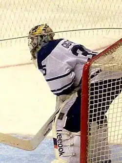 Giguère was traded to the Toronto Maple Leafs on January 31, 2010, in exchange for goaltender Vesa Toskala and forward Jason Blake.[9] Three days later, Giguère played his first game for the Maple Leafs and recorded a 30-save shutout against the New Jersey Devils. He registered another shutout in his next game against Ottawa on February 6 to become the first goalie in franchise history to record shutouts in his first two games.[10] This accomplishment led Giguère to be named the NHL's Second Star of the Week on February 8.[11] After having recorded a 3.14 GAA and .900 save percentage in 20 games with the Ducks before being traded, he improved to a 2.49 GAA and .916 save percentage in 15 games with Toronto.