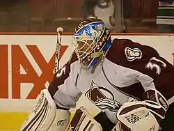 On July 1, 2011, free agent Giguère signed a two-year, $2.5 million contract with the Colorado Avalanche.[12][13] He embraced his role in the Colorado locker room as the veteran mentor, especially for young starting goaltender Semyon Varlamov. Giguère's leadership was key in a four-game home stand in mid-December when Varlamov was sidelined with a back ailment; Giguère started all four games and won them all, securing the Avalanche a team-record, eight-straight wins at home. It was the most consecutive home wins the franchise had seen since the Quebec Nordiques won ten-straight in 1995 before the club moved to Denver later that year to become the Avalanche. Giguère was named one of the three NHL's three stars of the week for late December. A groin pull on February 15, 2012, during a losing effort to the Vancouver Canucks, however, sidelined Giguère, allowing Varlamov the opportunity to redeem himself and reclaim the starting position in net for the remainder of the race to the 2012 playoffs, which Colorado ultimately did not qualify for. On August 13, 2012, Giguère signed a one-year, US$1.5 million contract extension through the 2013–14 season.[13][14]