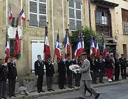 A commemorative marble plaque is affixed to the facade of the birthplace of Captain Danjou, in Chalabre (Aude, France). Every year, as close as possible to April 30, a squad of the Regiment of the French Foreign Legion at Castelnaudary comes to pay him military honors and the colonel of the regiment lays a wreath at the foot of the facade. Other commemorations also take place in Aubagne (Bouches-du-Rhone, France) where the headquarters of the Legion is located.