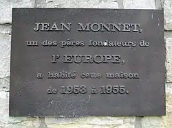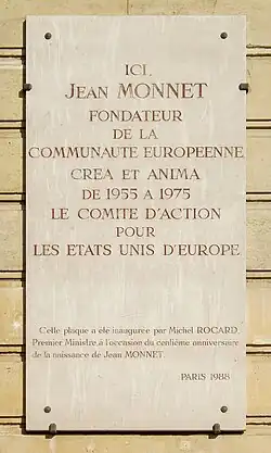 - commemorative plaques on the Willard Hotel in Washington DC, where he worked during World War II; the building at 18, rue de Martignac, where he created France's General Planning Commission; the Hotel Grand Chef at Mondorf-les-Bains in Luxembourg, where he lived in 1952-1953; the house at 138, rue des Muguets in Luxembourg, where he lived in 1953-1955; the building on 83, avenue Foch in Paris, where his Action Committee for the United States of Europe had its office from 1955 to 1975; and the house at Houjarray where he lived after 1945 and died in 1979.