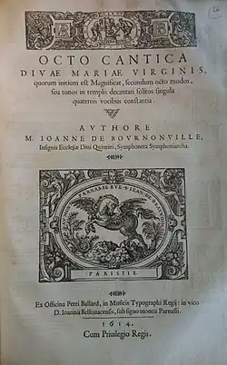 The same collection indicates him at that time as master of the children of the collegiate church of Saint-Quentin.[2] In 1613 Bournonville offered to the chapter of the Cambrai Cathedral a bound collection of his masses (probably the Parisian editions of Pierre I Ballard).[3] He remained in Saint-Quentin until about 1618.[4]