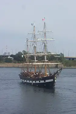 It was originally planned to launch the ship from her shipyard in Blennerville, but a 19th-century shipwreck was discovered by marine archaeologists while a channel was being dredged.[7] To preserve the find, on 19 April 2000, the hull of the Jeanie Johnston was hauled to the shore and loaded onto a shallow-draft barge. There she was fitted with masts and sails, and on 4 May was transported to Fenit, a short distance away. On 6 May, the barge was submerged and the Jeanie Johnston took to the water for the first time. The next day she was officially christened by President of Ireland Mary McAleese.[8]