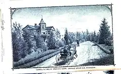 Her home, "Carmelita", became an intellectual center in Southern California.[4] Here, they laid out their beautiful property, a tract of 42 acres (17 ha), located on the northeast corner of Colorado Street and Orange Grove Avenue. In the course of years, it became noted for several things; first, its great variety of fruit and ornamental trees and plants-more than 200 in all-which Jeanne had obtained from nearly every part of the world; for the hospitality extended by its hosts to many eminent people, drawn to "Carmelita" by the personalities of the owners; and as well because of its beauty and interest. In a log cabin on these grounds, it is said that Helen Hunt Jackson, while visiting the Carrs, wrote part of Ramona.[11][4]