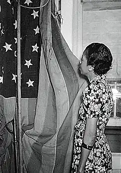 ![]() Jeannette Carter and flag used by John Brown on his attack on Harpers Ferry, August 1938 | |
