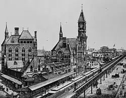 The Jefferson Market Prison was a prison in New York City at 10 Greenwich Avenue that opened in 1877, together with the adjacent Third Judicial District Courthouse. Frederick Clarke Withers designed these twin buildings in an ornate American Gothic style.[1] The landmark courthouse survived Jefferson Market's 1927 demolition and today serves as a New York Public Library branch.