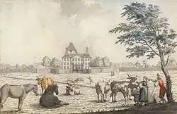 The Lords of Jegistorf were first mentioned in the 12th century, in the service of the Dukes of Zähringen.[2] They built the large square castle tower around that time.[3] The original castle was probably surrounded by wooden walls. During the 13th and 14th centuries, the wooden walls were replaced with stone.[4] In 1300, shortly before the Lords of Jegenstorf died out, the Erlach family acquired the herrschaft of Jegenstorf. However, the Jegistorf holdings had already been divided and the castle remained out of Erlach hands until the 14th or 15th century.[2][5] Through a combination of political marriages and purchases, in 1519, Johann von Erlach (1474–1539) became the ruler of the castle, the village, the herrschaft and the Jegenstorf court. During the same year he also became the Schultheiss of Bern.[4] It remained in Erlach hands until 1584. In 1584 it passed to the von Bonstetten family, who held it until 1675. It then went to the von Wattenwyl family who held it until 1720.[5] In 1720 Albrecht Friedrich von Erlach bought the castle back. Under Albrecht Friedrich, the castle was expanded and renovated. The old tower was rebuilt as a baroque tower house and the castle converted into a country manor house.[2]