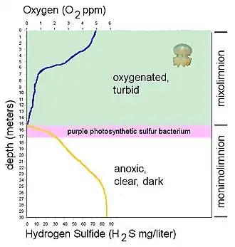 The anoxic layer extends from about 15 metres (49 ft) below the surface to the bottom of the lake. The oxygen concentration in this layer is zero. The hydrogen sulfide concentration rises from about zero at the top of this layer to over 80 mg/liter at the bottom of the lake. The top three meters of this layer contains a dense population of bacteria, at least one species of which is a purple photosynthetic sulfur bacterium. This bacterial layer absorbs all sunlight so that the anoxic layer below the bacterial plate is dark, but transparent. Hamner estimated the visibility to be about 30 meters. The anoxic layer also contains high concentrations of ammonia and phosphate which are almost completely absent from the upper layer. The anoxic layer is potentially dangerous for divers, who can be poisoned through their skin. This risk is mitigated as scuba diving equipment is not allowed in the lake, thus limiting the depths to which individuals may dive.[5]