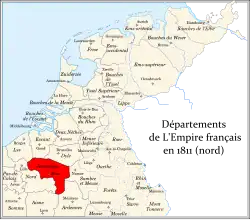Jemmape (French pronunciation: [ʒɛmap]) was a department of the First French Republic and of the First French Empire in present-day Belgium. It was named after the Battle of Jemappes, fought between the French and the Austrians in 1792 near the village of Jemappes, near Mons. Jemappes was spelled Jemmape, Jemmapes or Jemmappes at the time. Its territory corresponded more or less with that of the Belgian province of Hainaut. It was firstly created on 2 March 1793, and then recreated on 1 October 1795, when the Austrian Netherlands and the Prince-Bishopric of Liège were officially annexed by the French Republic.[2] Before annexation, its territory lay in the County of Hainaut, Tournai and the Tournaisis, the County of Namur (Charleroi) and the Bishopric of Liège (Thuin).