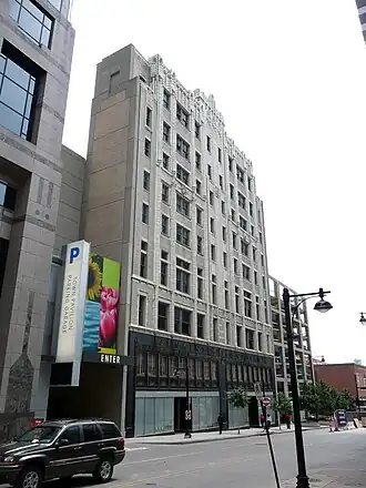 The building was constructed in two phases. A six-story building, built in 1911-12, was enlarged in 1931-1932 with an eight-story, south unit. Two additional stories were added atop the 1911-1912 unit as part of the enlargement. The building, constructed on a level grade, faces west onto Walnut Street. Modernistic in style, the building is an amalgam of Late Gothic Revival and Art Deco design elements. The most ornate area of the building's exterior; is the west facade, with embellishments and eighth story step-backs creating a strong vertical and rectilinear effect.[3]