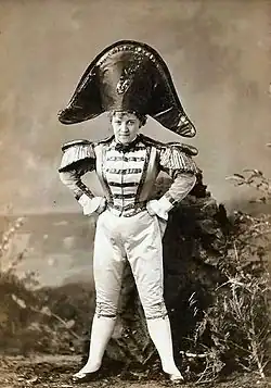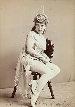 In the fall of 1869, some eighteen months after her father's death, Lee made her stage debut at London's Lyceum Theatre as one of the twelve pages in Chilpéric, an opéra bouffe with libretto and music by Hervé. At the same venue later in 1870, Lee was a crossing sweeper in Hervé's operetta, Le petit Faust, and in July 1870 at the Royal Strand Theatre she played Prince Ahmed in Henry James Byron's romance, The Pilgrim of Love.[8][9]