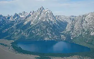 ![]() Aerial view of Jenny Lake in front of the Cathedral Group | |