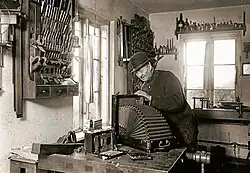 ![]() English: Jens Poul Andersen at work in his workshop at sit værksted Nellerødvej 18, 1904. | |
