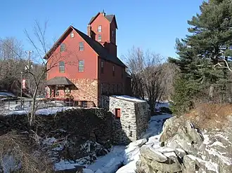 The historic district stretches along Vermont Route 15, which is known as Main Street in the western portion and Church Street in the eastern portion of the district. These two roads meet at a small triangular green, from which Lee River Road and Plains Road extend south. The western boundary of the district is roughly Lawrence Heights, and its eastern boundary roughly Griswold Street. In addition to buildings lining Church and Main Streets, the district includes properties on Lee River Road, Plains Road, and Old Pump Road, and it includes the archaeological remains of the mill complexes on either side of the Browns River, which roughly parallels VT 15. Most of the buildings are wood frame structures, with the brick Congregational Church (1826) and Galusha House (1790) as prominent exceptions. The village's industrial past remains visible in the Old Red Mill and Mill House (aka the Chittenden Mill), located at the western end of the historic district and now a museum property of the local historical society.[2]