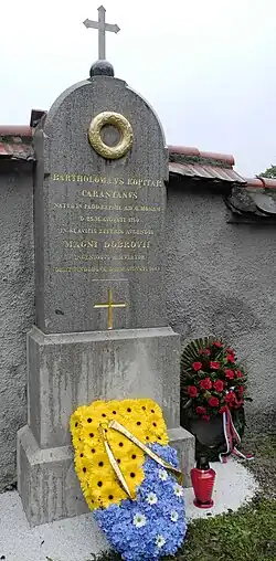 Kopitar died in Vienna on 11 August 1844, reportedly with Karadžić standing at his deathbed. He was buried in St. Marx Cemetery in Vienna, and the theologian Michal Josef Fessl had a gravestone for Kopitar erected there in October 1845.[4] Kopitar's remains and gravestone were moved to St. Christopher's Cemetery in Ljubljana in 1897.[4] In 1955, Kopitar's remains were transferred to Navje Memorial Park, where his gravestone is also now displayed, at the edge of the former St. Christopher's Cemetery.[5] A neighbourhood in Belgrade, the capital of Serbia, called Kopitareva Gradina, is named after him.