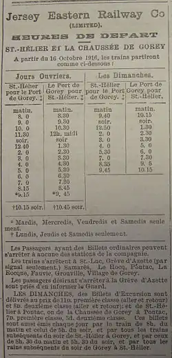 The line began at Saint Helier, with intermediate stations located at Georgetown, Samarès, Le Hocq, Pontac, La Rocque and Fauvic, with the eastern terminus in Grouville, originally opposite the Wimbledon Hotel, later extended to Gorey and then to Gorey Pier.[4]