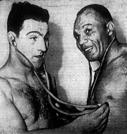 After this first victory, Walcott fought on and off throughout the rest of the decade (Walcott lacked professional management and a regular training routine, causing him to struggle during his early career).[6] Although he defeated a young Elmer Ray, he lost two bouts to Tiger Jack Fox and was knocked out by heavyweight contender Abe Simon in 1940. After losing to Simon, Walcott was inactive for over four years. During World War II, Walcott secured a wartime job, and did not fight again until 1944, winning two matches against local fighters Felix Del Paoli[7] and Ellis Singleton.[8]