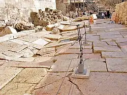 One of the most striking finds located in the Second Temple compound of the park is a paved street adjacent to the Western Wall. The street was part of the complex, from which pilgrims could access the western entryway of the Temple.[7] Along the street, adjacent to the wall, a series of shops were uncovered, perhaps for ritual items related to worship.[8] The continuation of the street was discovered in 2007 on the slopes of the City of David near the Pool of Siloam, where the road ends.