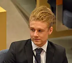 Jesper Jens Joakim Skalberg Karlsson (born 18 June 1993) is a Swedish politician of the Moderate Party. He was a Member of the Riksdag from January 2015 to September 2018, representing his home constituency Gotland County.[1] He replaced Gustaf Hoffstedt who resigned his seat. He is also the Baby of the House since taking office, replacing Dennis Dioukarev who is only 3 months older. He regained his seat in the 2022 general election.[2]