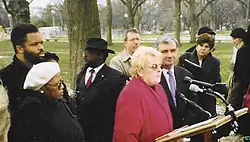 Jackson gave a prime-time speech at the 2008 Democratic National Convention on August 25, 2008.[97] During his speech he referenced Martin Luther King Jr., stating, "I'm sure that Dr. King is looking down on us here in Denver noting this is the first political convention in history to take place within sight of a mountain top."[98][99] Jackson said, "I know Barack Obama. I've seen his leadership at work. I've seen the difference he has made in the lives of people across Illinois."[100] At the convention, Jackson started what was described as a "hugfest" in an attempt to unite the Illinois Democratic party, which had been squabbling internally. He started by hugging Bobby Rush (who had been upset that Jackson's wife was being positioned for Rush's seat when Rush had been ill earlier in the year) and then he hugged Debbie Halvorson, who had been at odds with him over the proposed airport. He then asked if anyone else was mad at him. At this point Mayor Daley jumped up to hug Jackson. Jackson then said, "I'm not going to be satisfied until I see Rod Blagojevich give Mike Madigan a hug."[101][102]