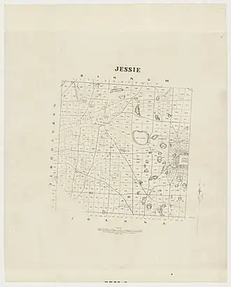 Jessie is reported as being proclaimed on 28 April 1876 by one source while official sources such as the South Australian Government Gazette contain no mention of any proclamation.[7] However, the government gazette does show that land within the town was available for purchase by November 1870 at the latest.[2] A drawing of the Hundred of Jessie prepared in November 1872 by the surveyor-general’s office shows that the town had been located and that a layout of its allotments and streets had been prepared.[8] The town is reported as being surveyed during May 1890.[1] In September 1891, during the second reading of The Park Lands Resumption Bill in the South Australian House of Assembly, it was stated that the town allotments in the Town of Jessie all remained unsold and that there were "no occupants on town lots" while the "suburban lands" had been "nearly all sold."[9]